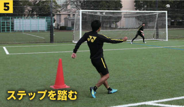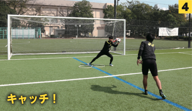 ❹ボールをキャッチ/ポイントは真後ろにバックステップすることとタイミングを合わせること。