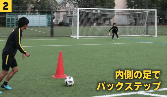 ❷FWがカットイン(右足にボールを持ち替える)してくるタイミングで片足をバックステップ