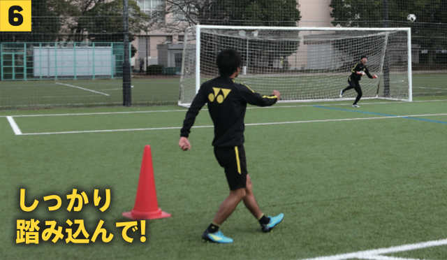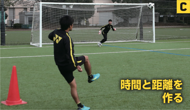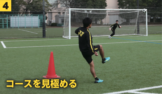 FWがボールを内側の足で持っている場合、ファーサイドに山なりのシュートを打つことも可能になる。
