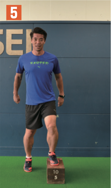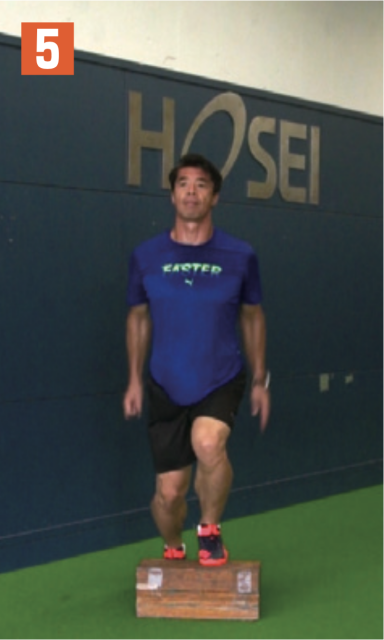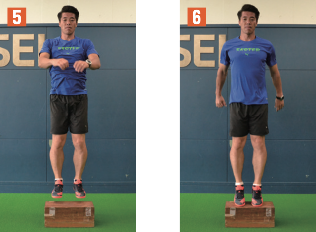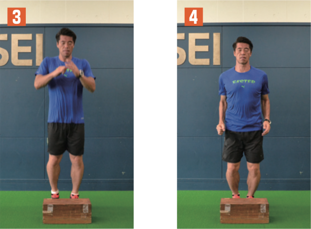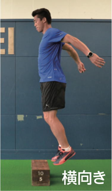 台を飛び越えて、地面に着地した足首が曲がりすぎないように注意。足に負荷が掛かっていることを感じながら行おう。飛んだときは背筋を伸ばし、身体が一直線になるイメージ。