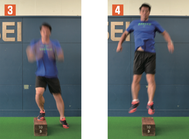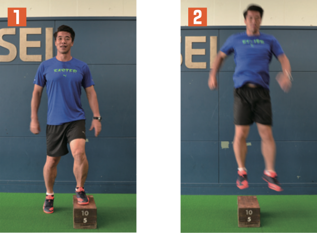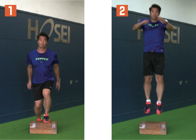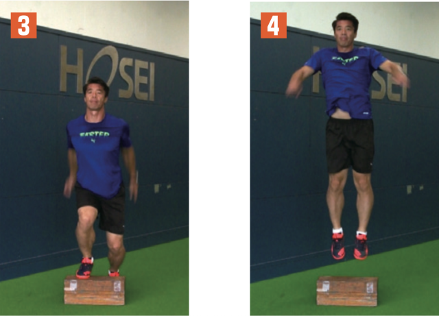 瞬発力を養うには、まずジャンプ力を高めるのが効果的だ。そのベースとなるジャンプ力を身につけるには、両腕両足を使い軽やかに飛ぶトレーニングを行う必要がある。用意した台の上に乗り、勢いをつけて跳びながら降り、再び勢いをつけて台の上に乗るという単純なメニューだが、テンポよく行うことで瞬発力が鍛えられる。足が接地する際には膝が曲がりすぎず、足首がつぶれないように注意しよう。