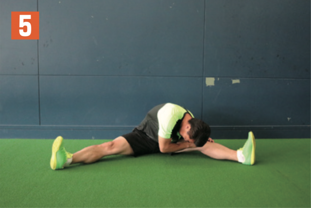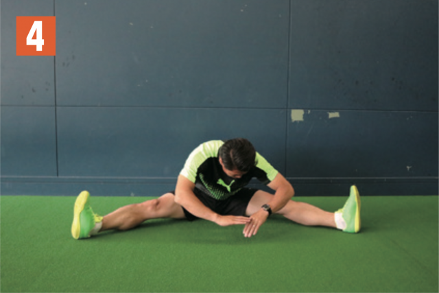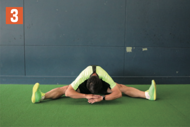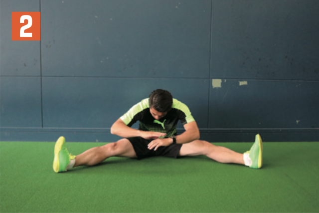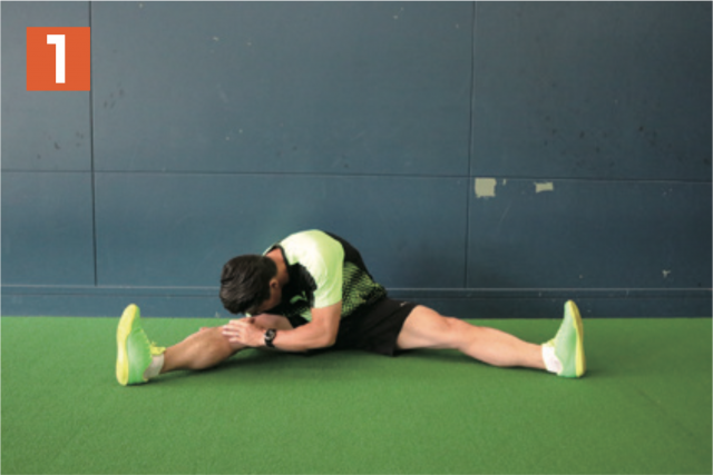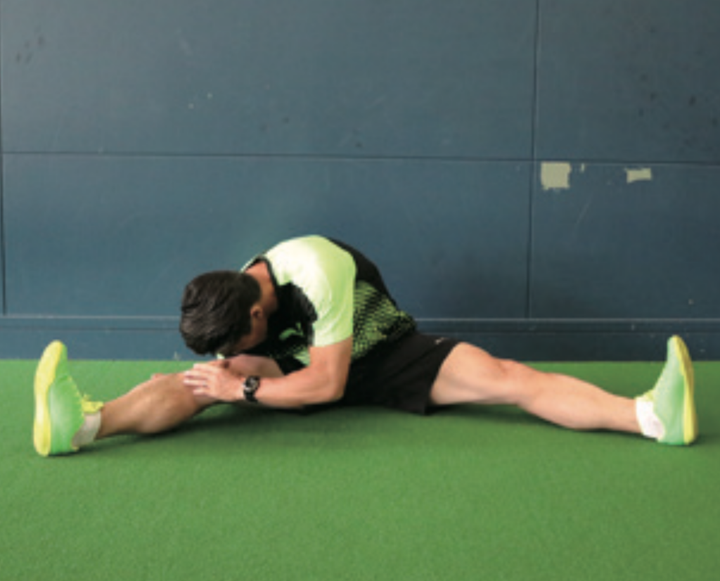 股関節とハムストリングの柔軟性を養うストレッチ。足をできるだけ開き、上半身を右、前、左と、テンポよく前傾させる。大事なのは広げた両足をしっかり伸ばしつつ、つま先が真上に向いた状態で行うこと。つま先が曲がっていると、効果が薄れるので注意。股関節の可動領域が広がるとともに、ケガ予防にもなるため、練習前には必ず取り入れたい。