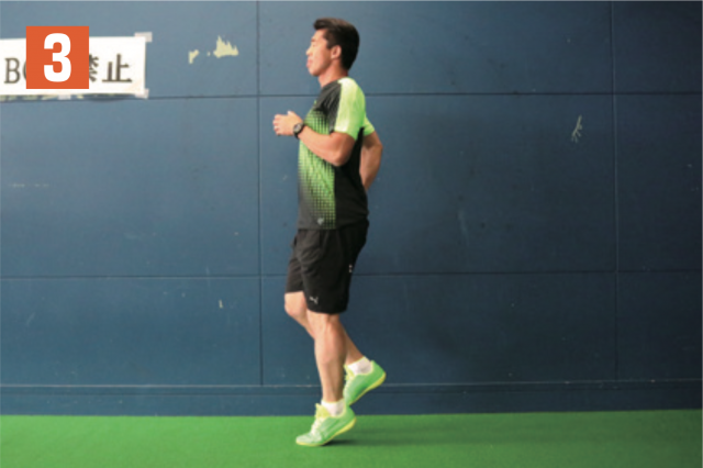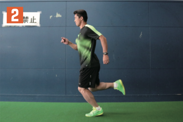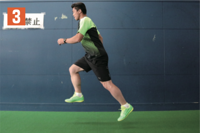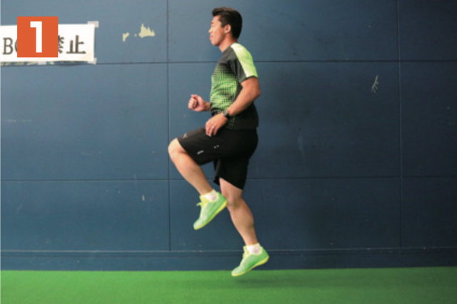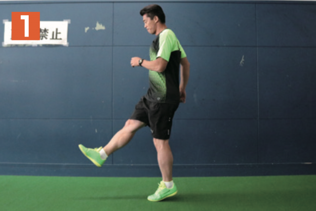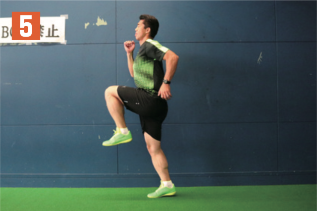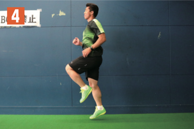 リズムを取りながら、片足の太ももを上げる動作を繰り返す。軸となる指示足が着地する瞬間に、もう一方の足の太ももが一番高い位置に到達するようにする(写真 2)。タイミングがずれてしまうと効果が得られないので注意。膝(太もも)は可能な限り、上げられるところまで上げ、軸足はなるべく曲がらないように着地することも心掛けよう。