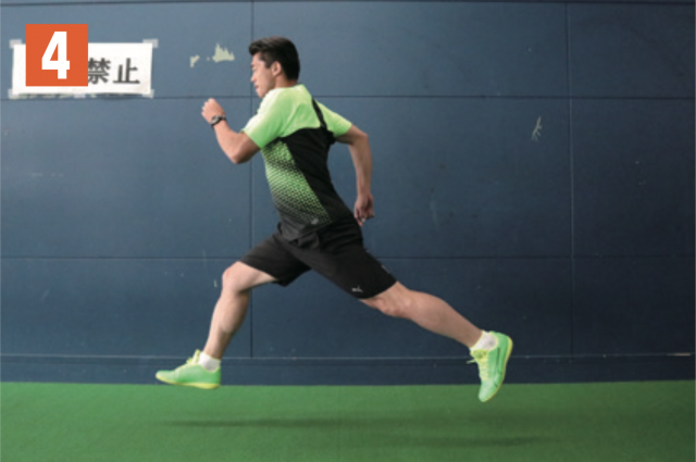片足(写真では右足)を前に蹴り出し、戻した反動を利用して、次の一歩で大きく前に踏み出す。重要なのは、前足の着地と後足の着地が同時になるようにタイミングを合わせること。背筋をしっかりと伸ばし、なるべく大きく足を前に開くこと。このトレーニングは、ステップワークやランニング時における足の運びのタイミングにもつながっていく。