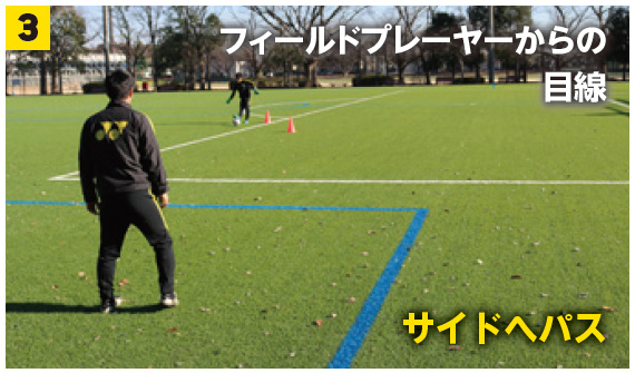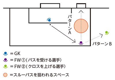 - FW①はGKが縦のボールを狙っているようであれば、サイドへのパスを選択。