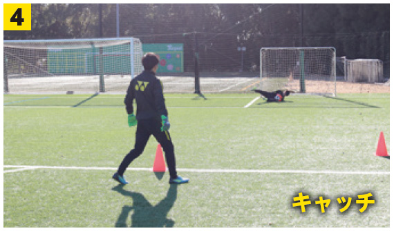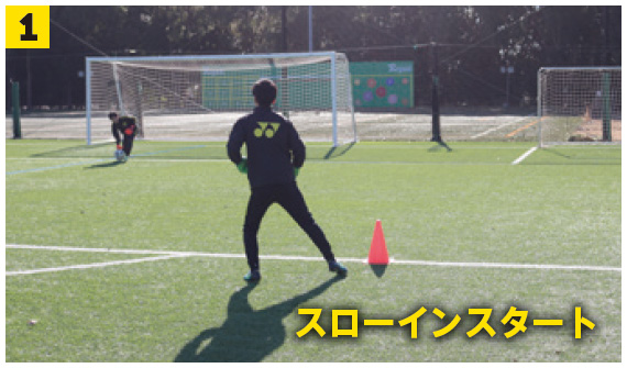 今回のトレーニングは、ポジションを取りながらのクロスキャッチである。実際の試合中は、クロスボールが上がってくる前に、GKが余裕を持てる時間は限られている。その状況で、いかに自分で時間を作り出し、安定したプレーにつなげるかを引き出すメニューを紹介する。