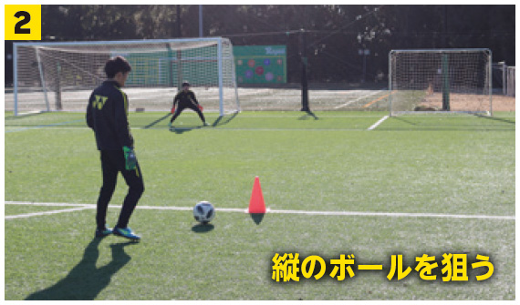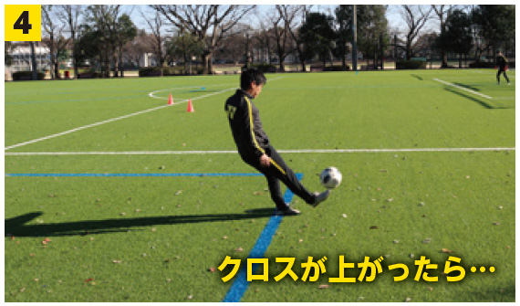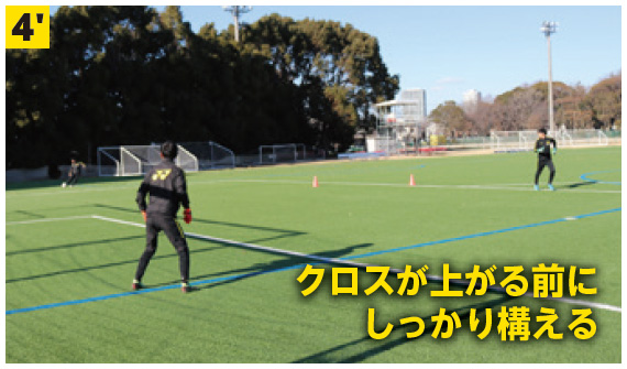 シュートとクロスをしっかりと見極めて正しいポジショニングをする力を養う。