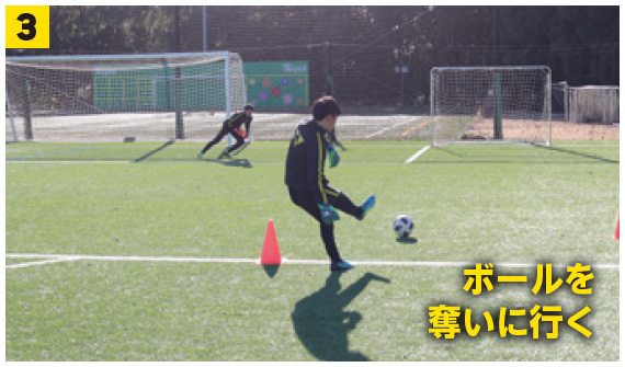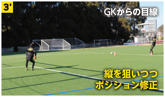GKはより早い準備を心がけ、FW役はGKに時間を与えないよう、パス&コントロールの質を高める。