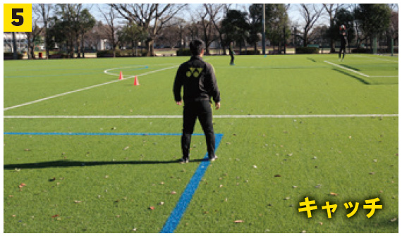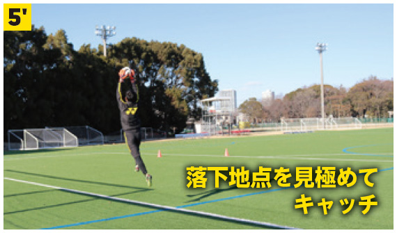 (4′ 5′ タイミングよくジャンプをして、高い位置でのボールキャッチを心がける。)