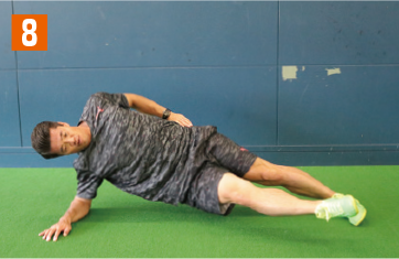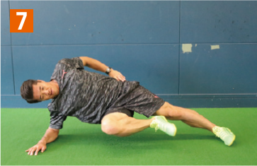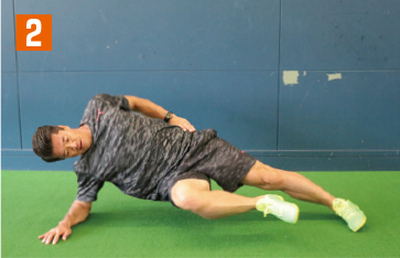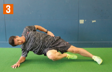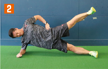 走る動作に近い体幹トレーニングを紹介する。まさに相手と接触しながら走る動作に効果てきめんのメニュー。まず横向きの体幹基本姿勢を取り、そこから上の足を胸元へと引き上げていく。その際、地面側の腰や膝が下がって「く」の字にならないように注意しよう。また背筋が曲がってしまえば、トレーニング効果は半減してしまうため、上から見て一直線になっている状態をキープすること。胸元へと引き上げる足は、可能な範囲でギリギリまで胸へと近づけること。引き上げる足も、膝から下までが真っ直ぐになるように注意。