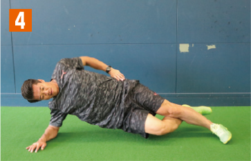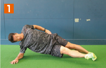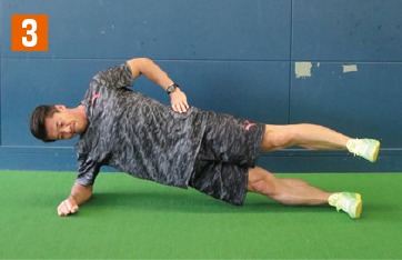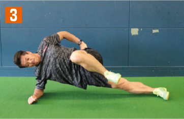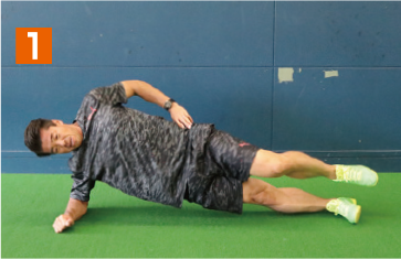 地面側の肘と足で身体全体を支える横向きの体幹基本姿勢をとる。そこから、腰の位置が下がらないように注意しながら、上側の足を徐々に上へとあげていく。このとき、足と膝を伸ばした状態で行うこと。膝が曲がっていたり、猫背になっていると適切な負荷が掛からなくなり、効果は半減してしまう。