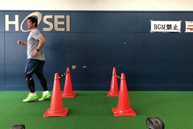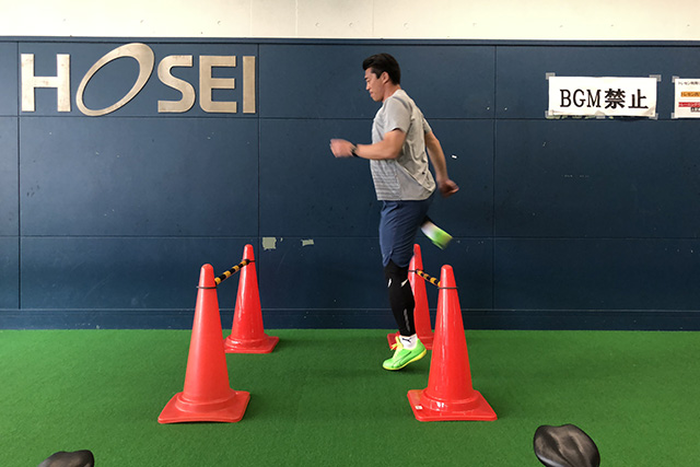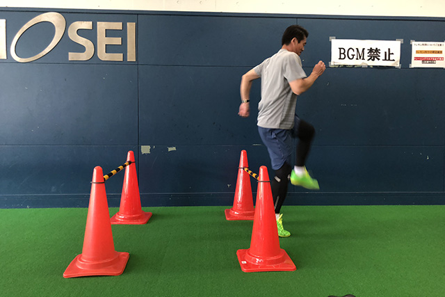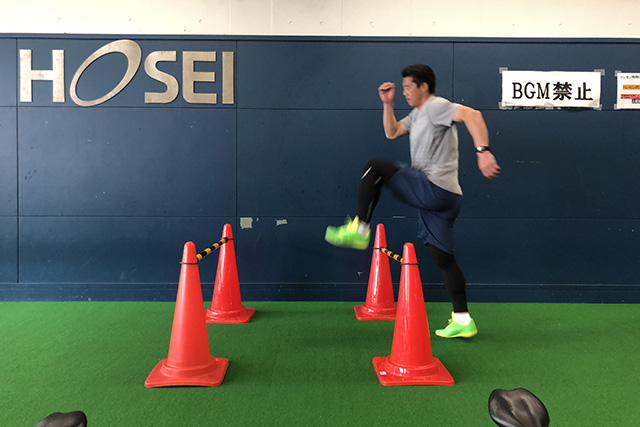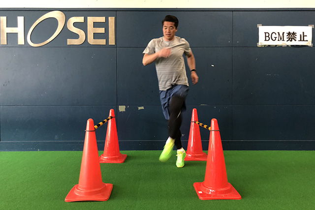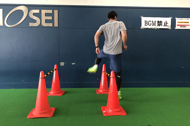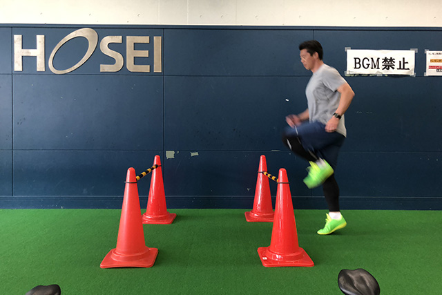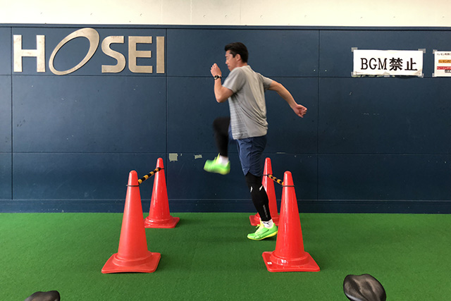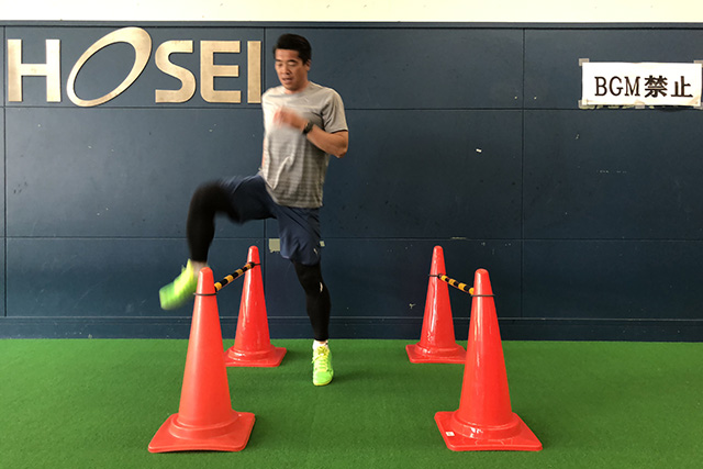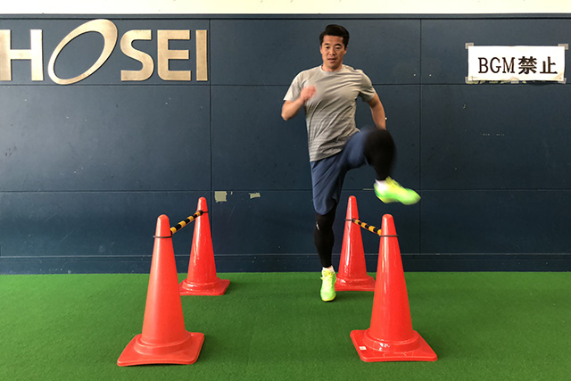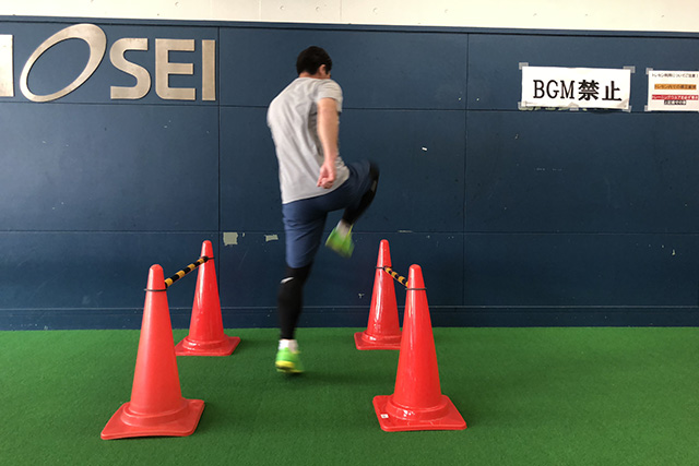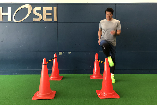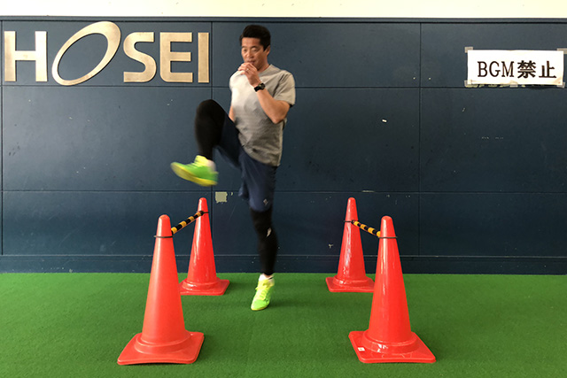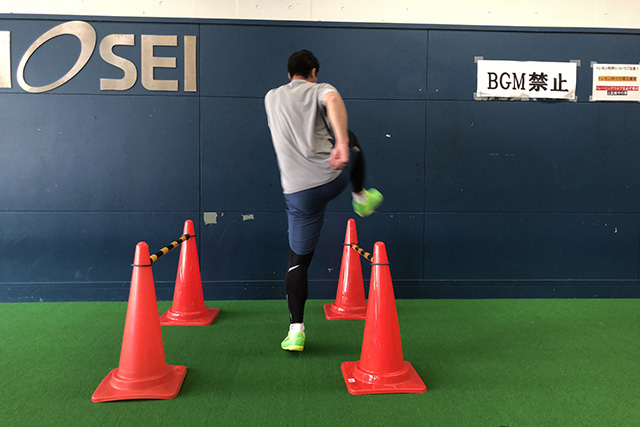 股関節の可動領域を広げるためにも、大きくポールを越えて、支持足が曲がらないように注意しよう。また、重要なのが大きく腕を振ること。腕を使わなければ、体幹を保ったまま移動する動作になっていないので、背筋や姿勢を意識しながらトレーニングを行おう。