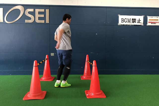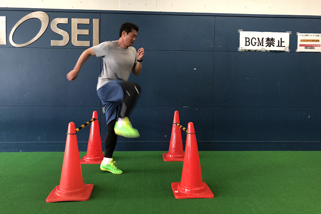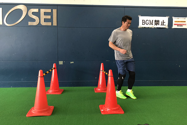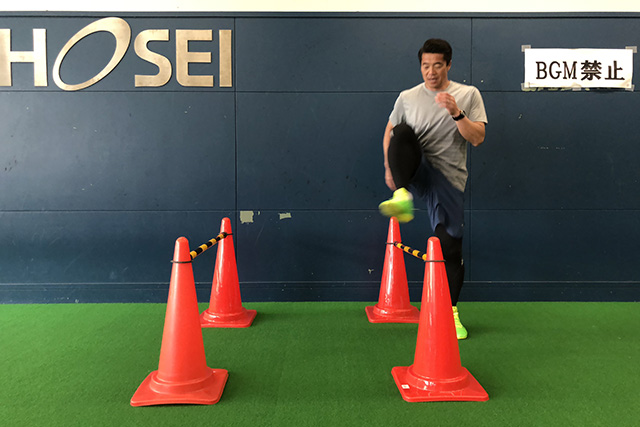 ポールに対して内側の左足(写真)でポールを越えたら、右足(写真)でポールを越える際にターンして、今度は右足から次のポールを越える。そして、再びターンをして正面に向き直る。この動きを5往復を1セットで繰り返す。