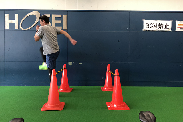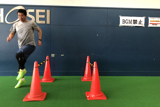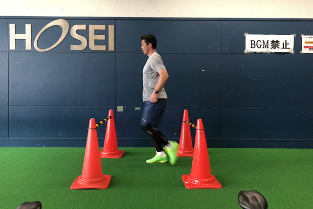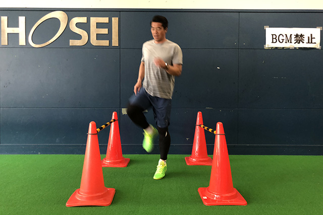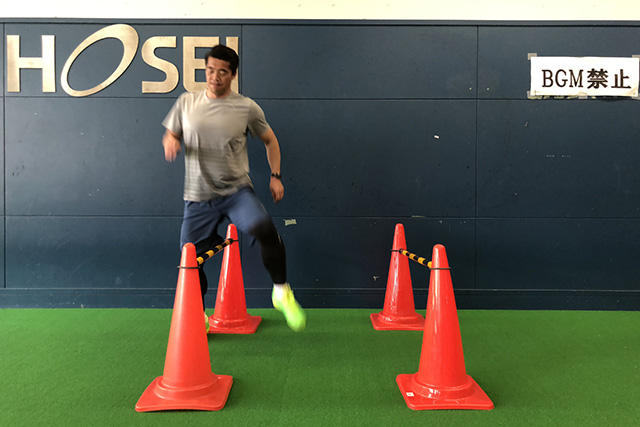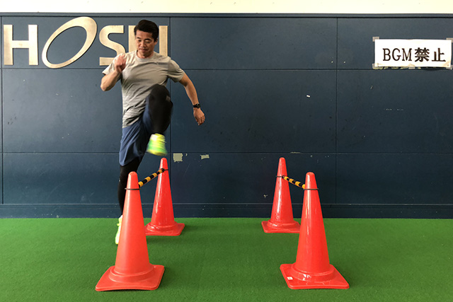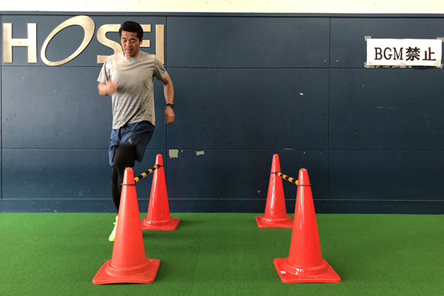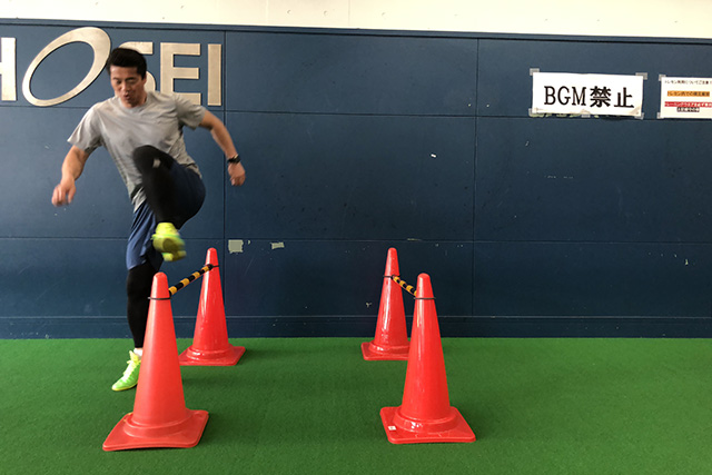 ポールに対して内側となる右足を上げ、ポールをまたぎ、続いて左足もポールをまたぐ。それを2回行ったら逆の右足からポールをまたいで往復。注意点としては支持足の膝を曲げないこと。その状態で、どれだけポールを越える足を大きく外側に広げられるかも大事。横方向の動きに対して姿勢が崩れないように気をつけよう。