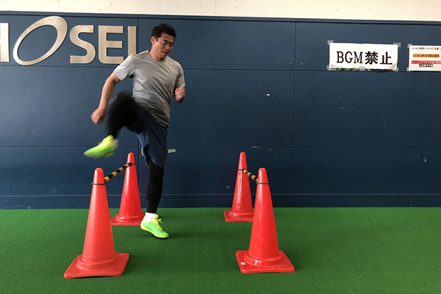 世間一般に体幹トレーニングが認知されてきたこともあり、身につけた体幹を、より実戦で活かすトレーニングを紹介していく。今回は用具を使用するが、練習環境において、三角コーンとポールがなければ、ハードルなどで代用してもOK。トレーニングの効果としては大きく3つ。股関節の可動領域の改善、ボディバランスの養成、体幹を活かした上でのスムーズな移動(動作)となる。