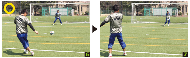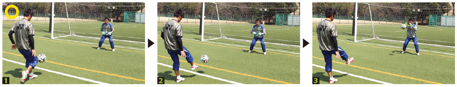 もう1つはタイミングに関して。キッカーがボールを蹴ったとき、両足が地面に着いている状態こそが、正しいタイミングです。しかし、シュートが飛んできているのに、両足が地面に着いていないと、頭ではボールに反応しているつもりでも身体の動きは遅れてしまいます。正確なタイミングを身につけるように練習してください。