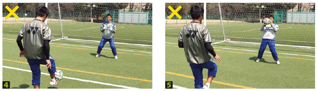 LESSON1のキャッチの練習で、写真4や5のように、GKがしっかりと構えていない状態でボールが配給されているとすれば、良い技術、良いフォームは身につきません。それはボールが「顔付近に飛んでくる」と分かっているので、先に手を出してキャッチしてしまう、または身体を後ろに倒してキャッチしてしまうなど、雑にプレーしてもキャッチできてしまうからです。これでは試合のための練習にはなりません。
