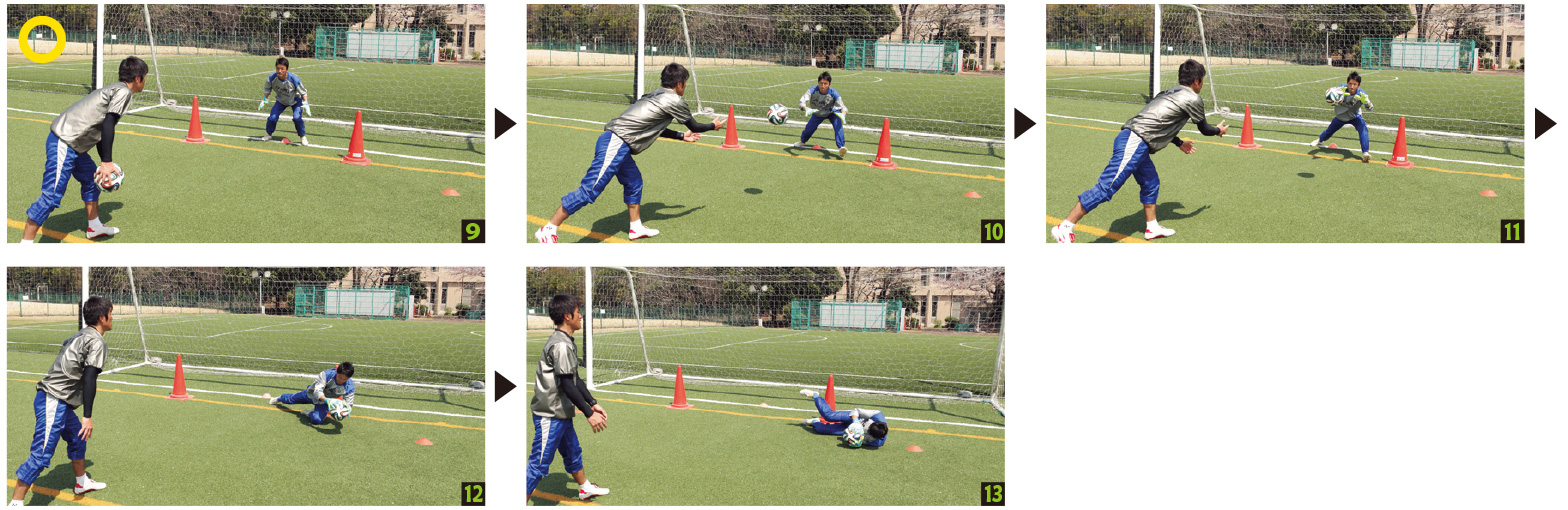 セービングをする際に、常にプレーの方向を意識することで、失点の可能性は減ります。どこにボールが来るのか分かっていても、先に腕を出すことなく、毎日行われる練習での基本動作を、毎回丁寧に繰り返すことが、実戦の場では大いに役立つはずです。