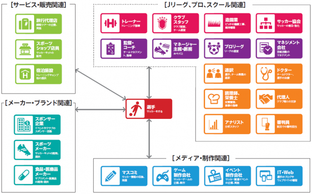 トレーナーやコーチ、マネージャー、フロントスタッフなど、直接的にサッカークラブに関連する仕事はもちろん、食品や飲料メーカーに就職し、商品訴求のプロモーションとしてプロ選手、アスリートを広告に起用し、栄養サポートで関わること、メーカーの事業部門でスポンサードするサッカー競技にて、プロ・アマを問わず関連業務を行うこともあります。既存の業種に限らず、今この瞬間もサッカーという巨大な市場では、日々新たなビジネスが生まれ続けているのです。