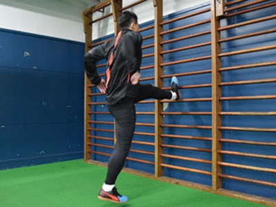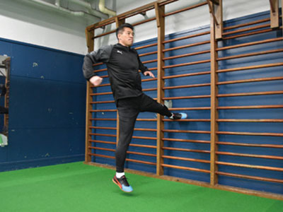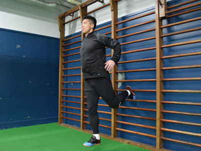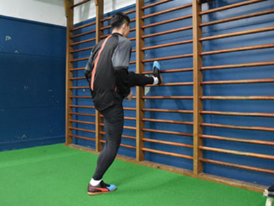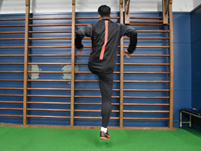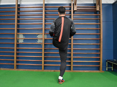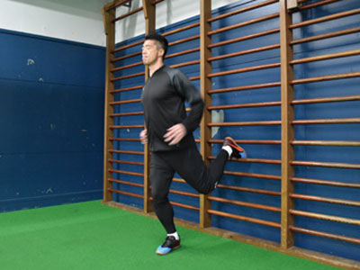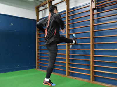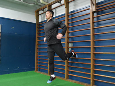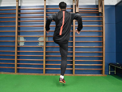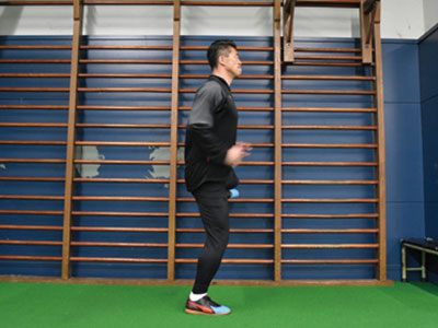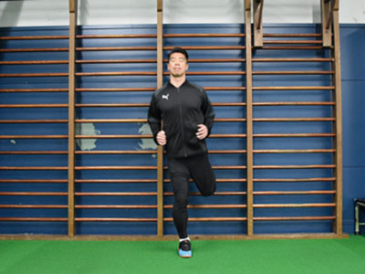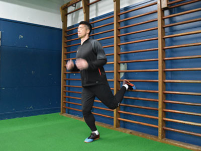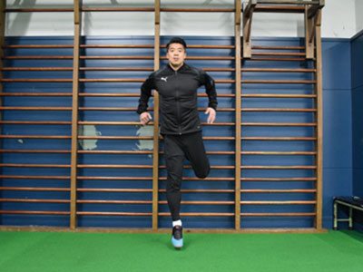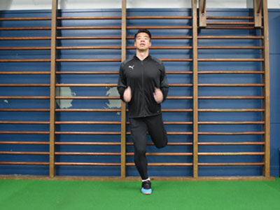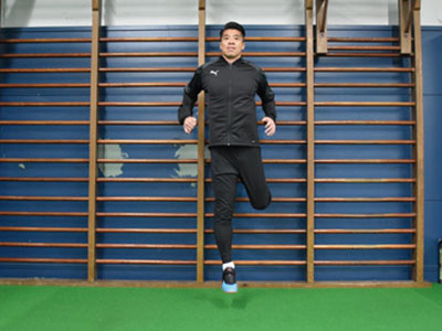 足を乗せる台を背にして、片足を乗せる。フロント時よりも、低い位置でOK。軸足で身体を支え、片足ジャンプを繰り返す。3種目ともに共通することだが、高く飛ぶことよりも姿勢を崩さず、足裏全体で地面を踏むことを意識する。走っているときに近い状態なので、膝が曲がらないことと、前傾姿勢にならないように身体を起こしてジャンプを繰り返す。台に乗せた足の力を抜くこともポイント。
