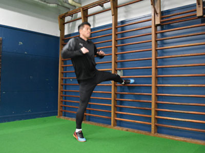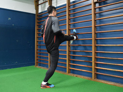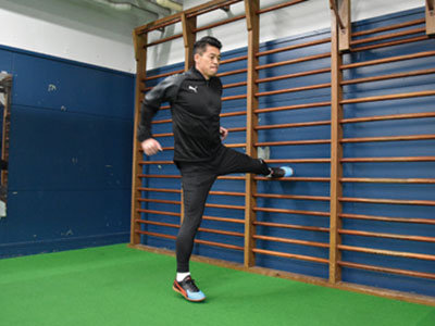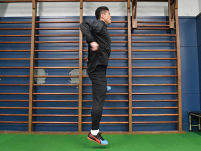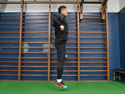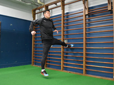 台に対して横向きになり、片足を乗せて、片足ジャンプを繰り返す。台に乗せた足が地面と並行になるくらいの柔軟性は持ってほしいところ。やはり膝が曲がることなく、ジャンプした軸足の足裏全体で地面を踏むこと。前傾姿勢にならず、正しい姿勢をキープ。ジャンプするときは、両腕を使うことも忘れずに。この動作は、サイドステップやターンをするときの動きにも活きてくるはず。