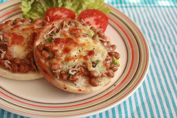 - 納豆に万能葱のみじん切りを適量、しょうゆ、ちりめんじゃこを入れてよく混ぜる。マフィンを2つに割り、片面に全体に広げる。2枚つくる。上にチーズをのせる。