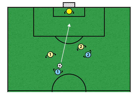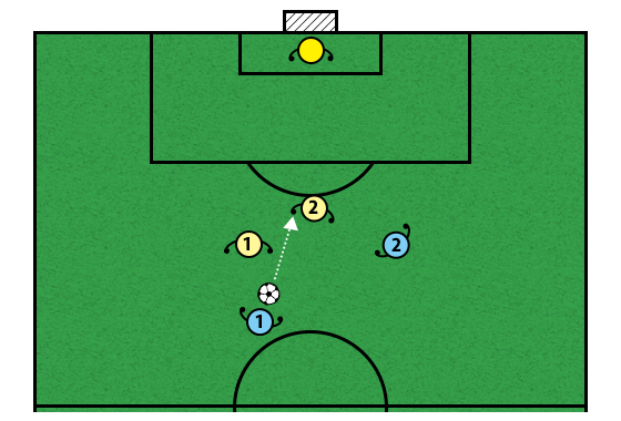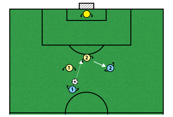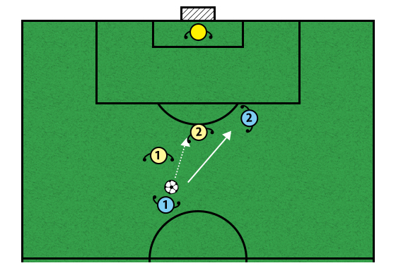 そうすると、パスの受け手②は相手守備者②のプレッシャーを受けずにゴールへ向かえます。
