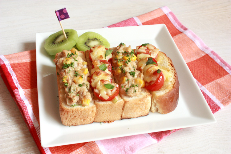 プチトマトのソースの方にはシュレッドチーズ、ツナコーンマヨネーズの方にはパルメザンチーズをのせる。 - 温めたトースターで、それぞれこんがりきつね色になるまで焼く。仕上げに、あればパセリやバジルを好みでトッピングする。
