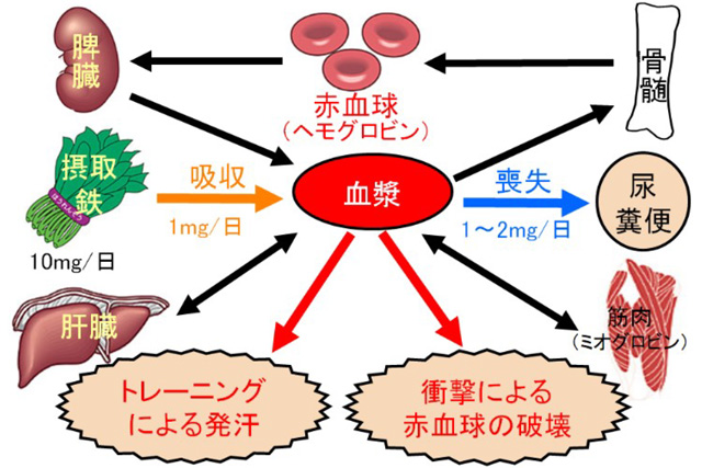また、衝撃により一部の赤血球が破壊をされることで、鉄分が喪失されることがわかっています。例えば、マラソン選手は足裏を地面にたたきつける回数が多いため、足裏の衝撃により赤血球が破壊されて、鉄分の一部が喪失されてしまうのです。