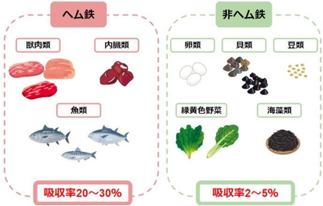 鉄分は、上記の図のように「ヘム鉄」と「非ヘム鉄」に分けられ、体内への吸収率が異なります。