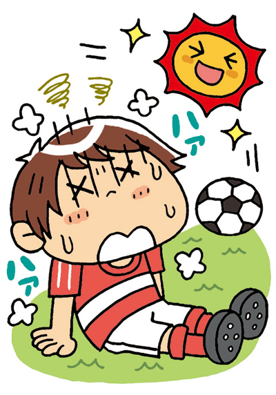 また、体調が悪いと体温調節機能が低下し、熱中症につながりやすくなります。日頃から食事、睡眠をしっかりとり、生活リズムを整え、サッカー活動を行う前には必ず体調をチェックするように。