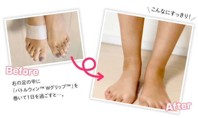 「バトルウィンTM WグリップTM」を足の甲に巻けば、脚のむくみと足先の冷え予防にもなります。自分で巻く時は、かかとを地面につけて、つま先を上げた体勢で巻くのがポイント。なお、足が小さい方はテープ幅50mmタイプでもOKです。