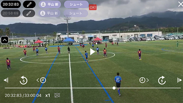 最大のポイントはスマートフォンを使って選手全員が共有できる点にある。まず撮影した試合映像をアップすれば瞬時に選手がチェックでき、シュートシーンやコーナーキックなどシーンによって自由にチャプターわけ(タグ付け)ができ、複数人での同時作業が可能。負担と時間を一気に解消できる。さらに大画面のテレビは必要なく、各々がスマホで容易にチェックできるため、遠征先でも場所と時間を選ばずチェックできるのだ。