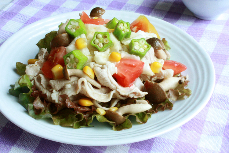 長イモは皮をむいて酢水にさらし、ビニール袋等にいれて叩いて細かくくずしておく。 - 器に、サニーレタス・豚肉・長イモ・トッピングのオクラ・コーン・トマトを盛りつけ、ドレッシングを添えていただきます。