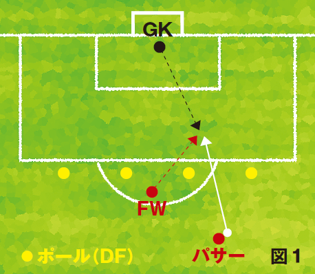 「DFラインの背後にスルーパスを出され、抜け出た相手との一対一」を想定したトレーニングを行う。