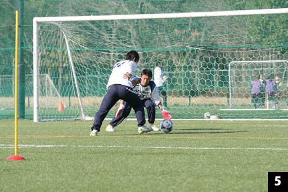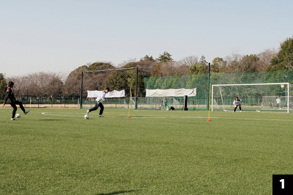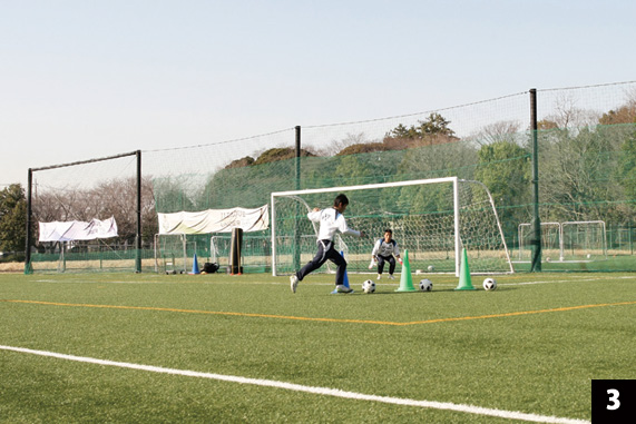 一対一の基本的な考え方は、「相手選手の選択肢を限定する」こと。このトレーニングでは、相手選手は①ダイレクトシュート、②ドリブルしてからシュート。そして実際の試合ではさらに③横パスを出して違う選手がシュートする、という3つの選択肢を持っている。