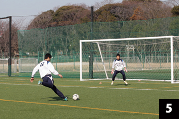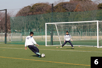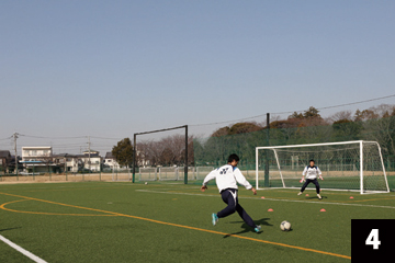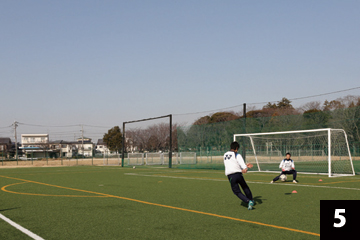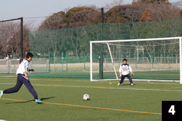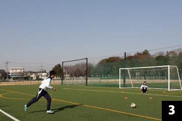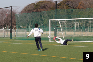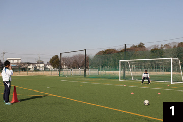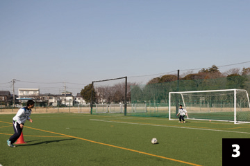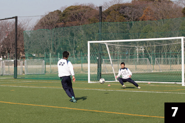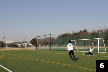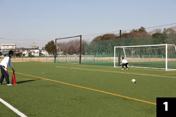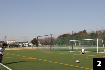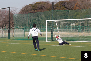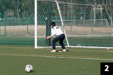 写真❶❷の状態でGKが構えの姿勢をとり、FWの合図とともにGKは素早くFW(ボール)に対して視点を合わせ、シュートに対応します。