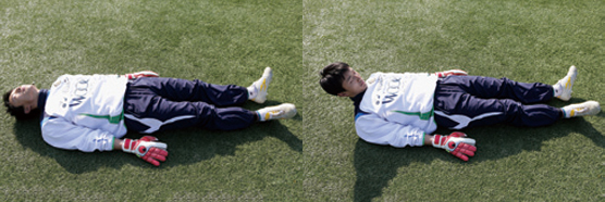 仰向けの姿勢から、ここでも首だけをお腹の方向へゆっくりと動かしていく。頭を下げたとき、地面に頭をつけない。1日10回×2セットを目標にはじめよう。