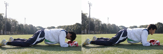 1日10回×2セット。肘を地面に付いた姿勢から、顔を起こすような動作。パンチングし、前方に倒れた際などにも、こういった動作が必要になってくる。