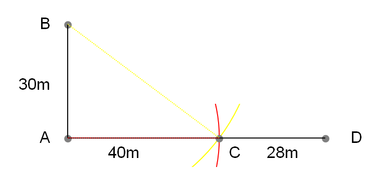 A地点からC地点を結んだラインを28m延長します(D地点)。40m+28mで、68mのゴールラインが完成しました。