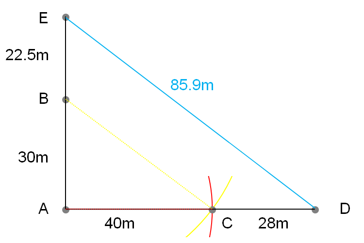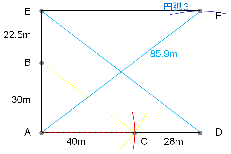 A地点から円弧3の方にメジャーを伸ばし、85.9mで重なった部分をF地点とします。