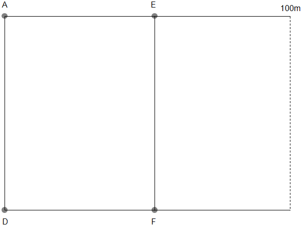 A地点にメジャーの0mを合わせ、E地点を通ってメジャーを100mの端まで伸ばします。反対側も同様に、D地点からF地点を通って100mの端まで伸ばします。これを結んだものを、100mの仮のゴールラインとします。