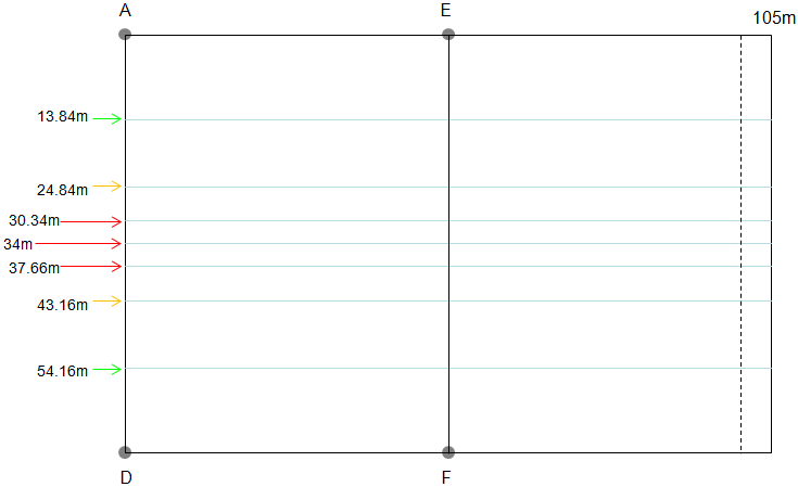 A地点からB地点を結んだタッチラインを22.5m延長し、ハーフウェーラインの地点Eを決めます(AB+BEが105mの半分、52.5mになります)。