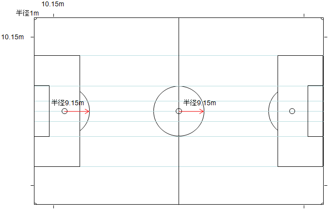 最後に、ペナルティーアーク、コーナーエリア、任意のマーク、センターサークルを描けば完成です。