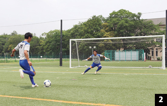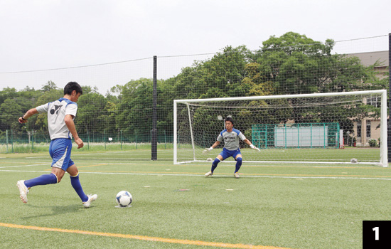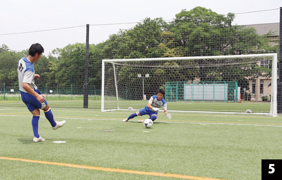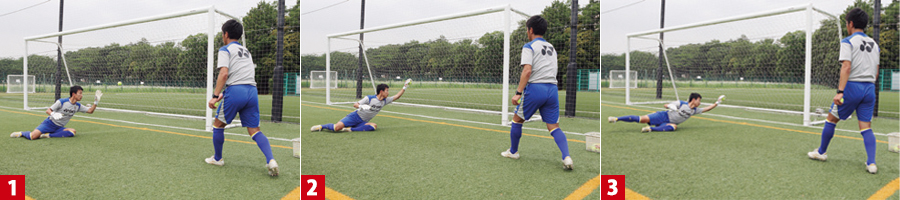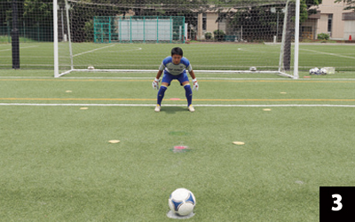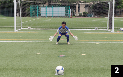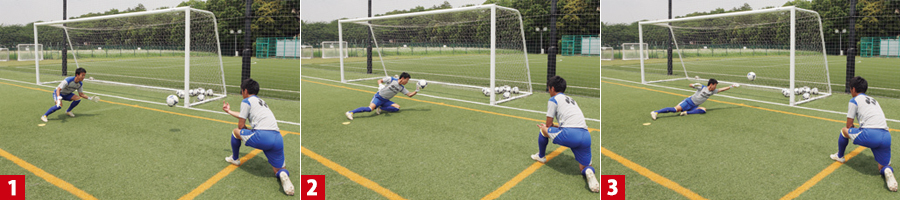 シュートする方向が決まっているからといって、打たれる前に動いて対応したのでは、試合でも「一か八か」の反応になってしまいます。必ず打たれてから対応する習慣を身につけましょう。