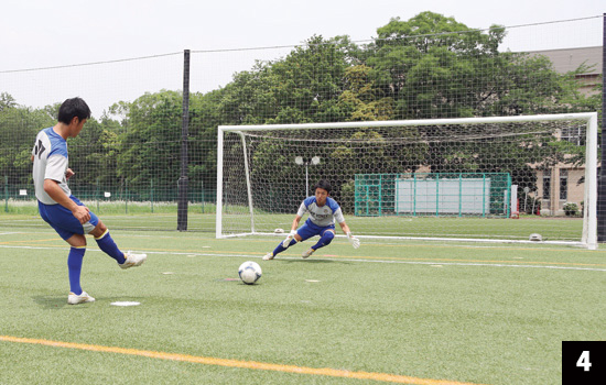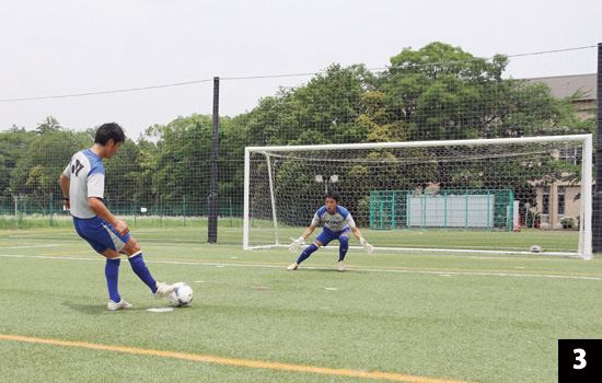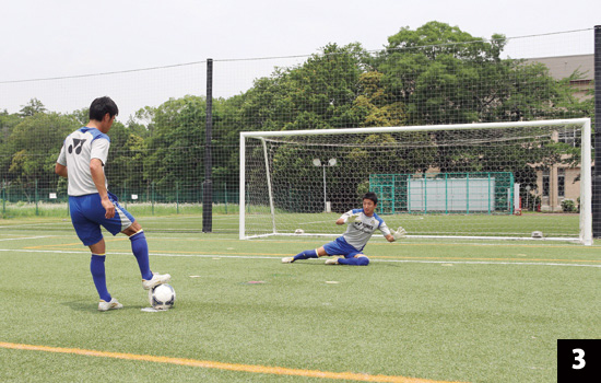 写真2は1対1になった時の構え。間合いを詰めた際は背後へのシュートは選択肢としてなくなるので、構えを低くします。写真3と比較しても分かるように、身体の斜め前に腕を伸ばしたほうが、たとえシュートに反応できなかったとしても、腕に当たる可能性も高まります。