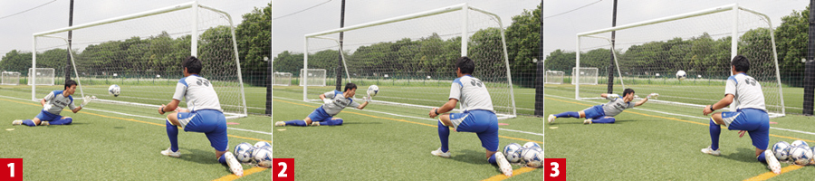 LESSON2は、実際のシュートへの対応です。最初は、キッカーが蹴る方向を決め、GKはそのシュートに反応します。しかし、試合ではキッカーは左右どちらにシュートするか分かりません。そのため留意点にもありますが、GKは必ずシュートを打たれてから反応すること。また、最終的には左右どちらにシュートを打たれても対応できるように、方向を決めずにシュートを打ってもらうなど、どちらにも対応できるようになると、セーブできる範囲も広がります。