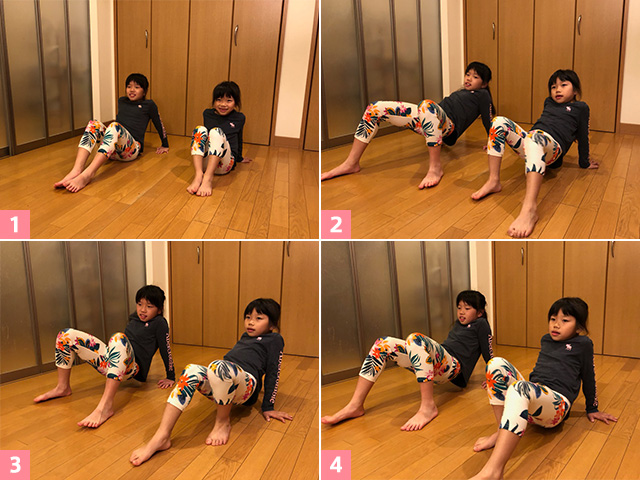 ①体育座りの姿勢から両手は後ろに回し、床に手をつける。
