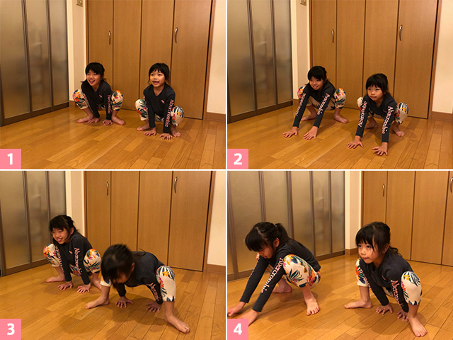 ①床に両手と膝をついた四つ這いの姿勢から膝を浮かしスタート。