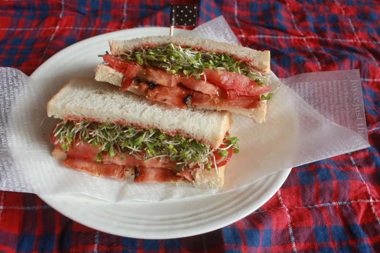 - 食パン1枚の片面に、ケチャップ、もう一方の片面にマスタードを塗り、トマト、ベーコン、スプラウトをはさむ。少し時間をおいて馴染ませたら食べやすくカットする。